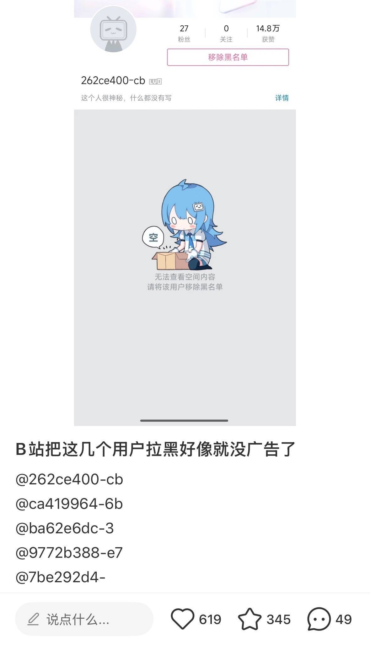B站、微博、小红书的多位网友发帖称:“在B站拉黑@9772b388-e7、262ce400-cb等几个广告视频号用户,再清理离线缓存后,B站的开屏等广告就会消失。”另有按此操作后发现开屏广告暂时消失的网友称,“安卓端实测有效,这是B站的Bug(系统漏洞)”。